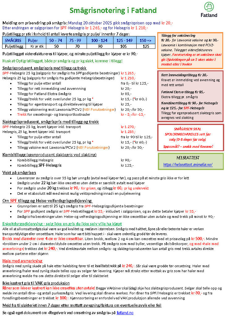 Den 13.oktober 2025 økte salgsprisen med 30 kroner, Fatland Ekstra økte med 15 kroner til 85,-, og puljer over 150 stk økte med kr 15,-. Øvrige puljer økte med kr 10,-. Fra 27.oktober økes vektgrensen for Optimaliseringstillegget (1,20/kg) for slaktegris med 5 kg til 100 kg