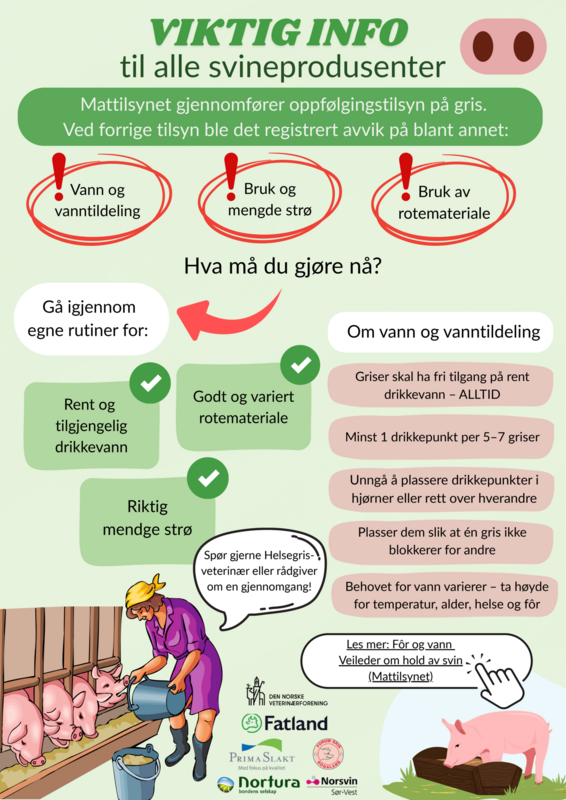 Mattilsynet har annonsert at smittevern og dyrevelferd i svineproduksjon er en av hovedprioriteringene for tilsyn i 2025. Dette innebærer at det vil bli gjennomført oppfølgingstilsyn for å vurdere forbedringer etter tidligere avvik, spesielt knyttet til vannforsyning, bruk av strø og rotemateriale. Husk også å oppdatere egen smittevernplan.