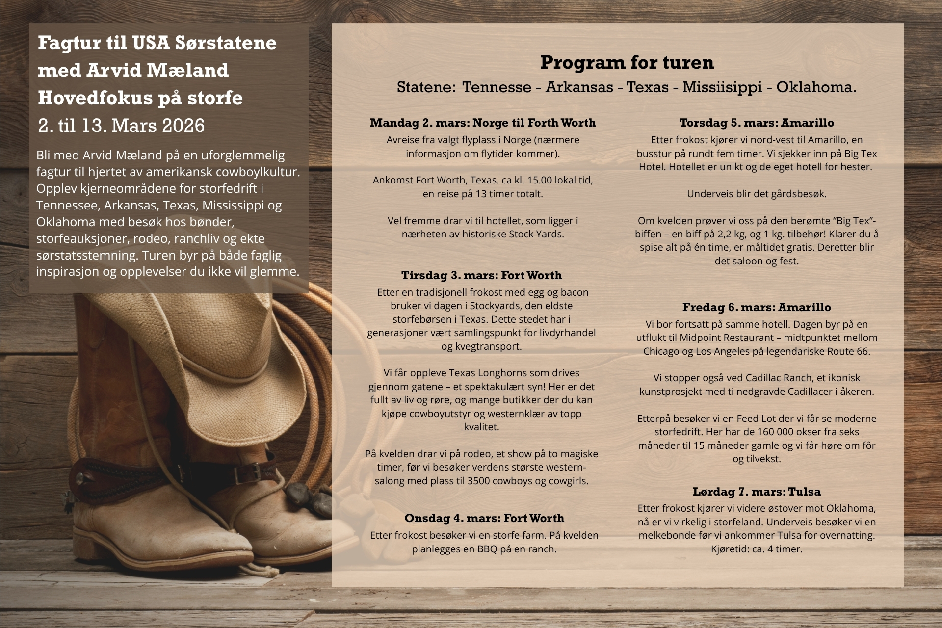 Turen går rett til hjertet av amerikansk cowboykultur med stopp i Tennessee, Arkansas, Texas, Mississippi og Oklahoma. Underveis får deltakerne oppleve kjerneområdene for amerikansk storfedrift med besøk hos bønder, storfeauksjoner, rodeo, ranchliv og ekte sørstatsstemning.