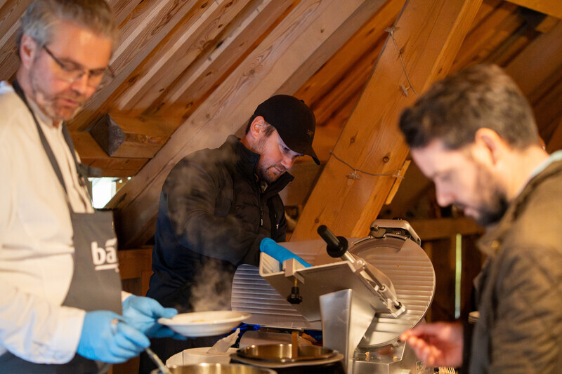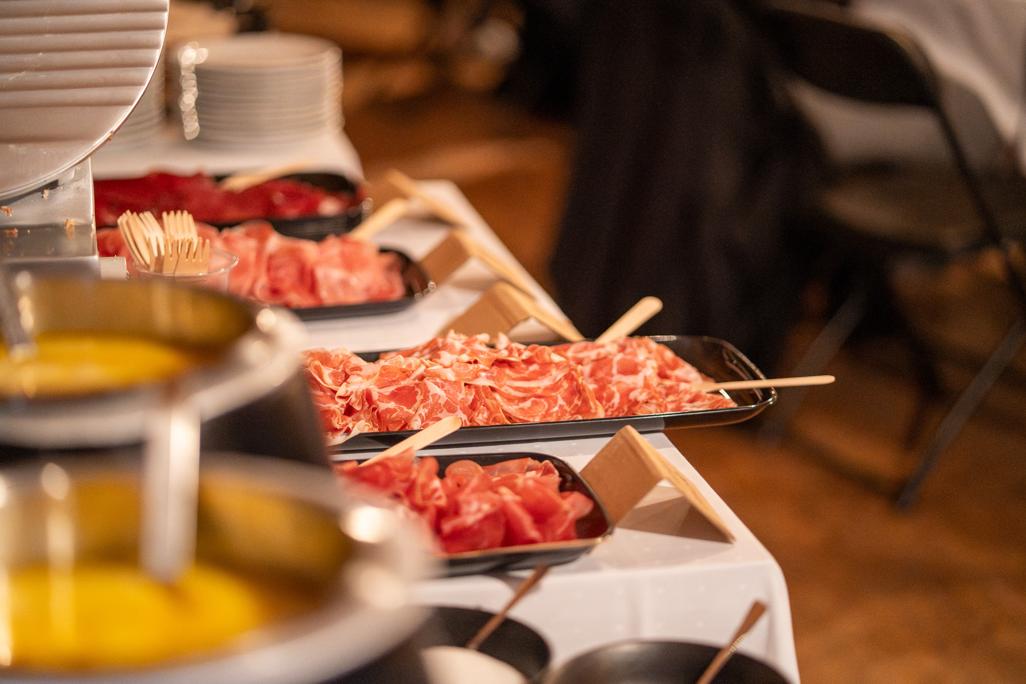 Kristian Fatland sto ved skjærefjølen og skar opp spekemat foran gjestene, slik at de kunne se håndverket og kjenne duften av ferskt oppskåret spekeskinke. Kristian er ansvarlig for spekemat- og pinnekjøttproduksjon på Fatland Jæren og lager spekemat som kombinerer norske råvarer fra våre bønder med italienske oppskrifter og metoder. Resultatet er spekemat i verdensklasse, etter vår mening.