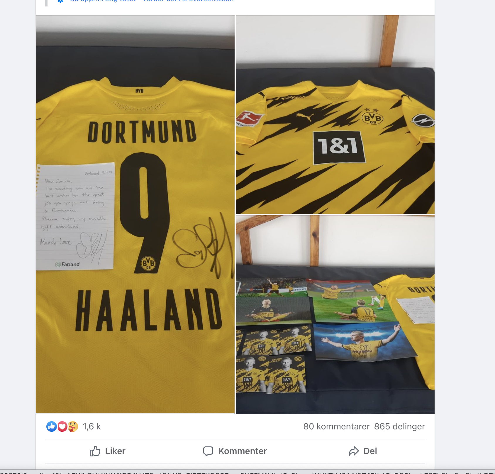Facebook-innlegget viser både signert trøye og bilder. MEN. Det vi i Fatland la ekstra godt merke til var selvsagt valget av brevpapir.