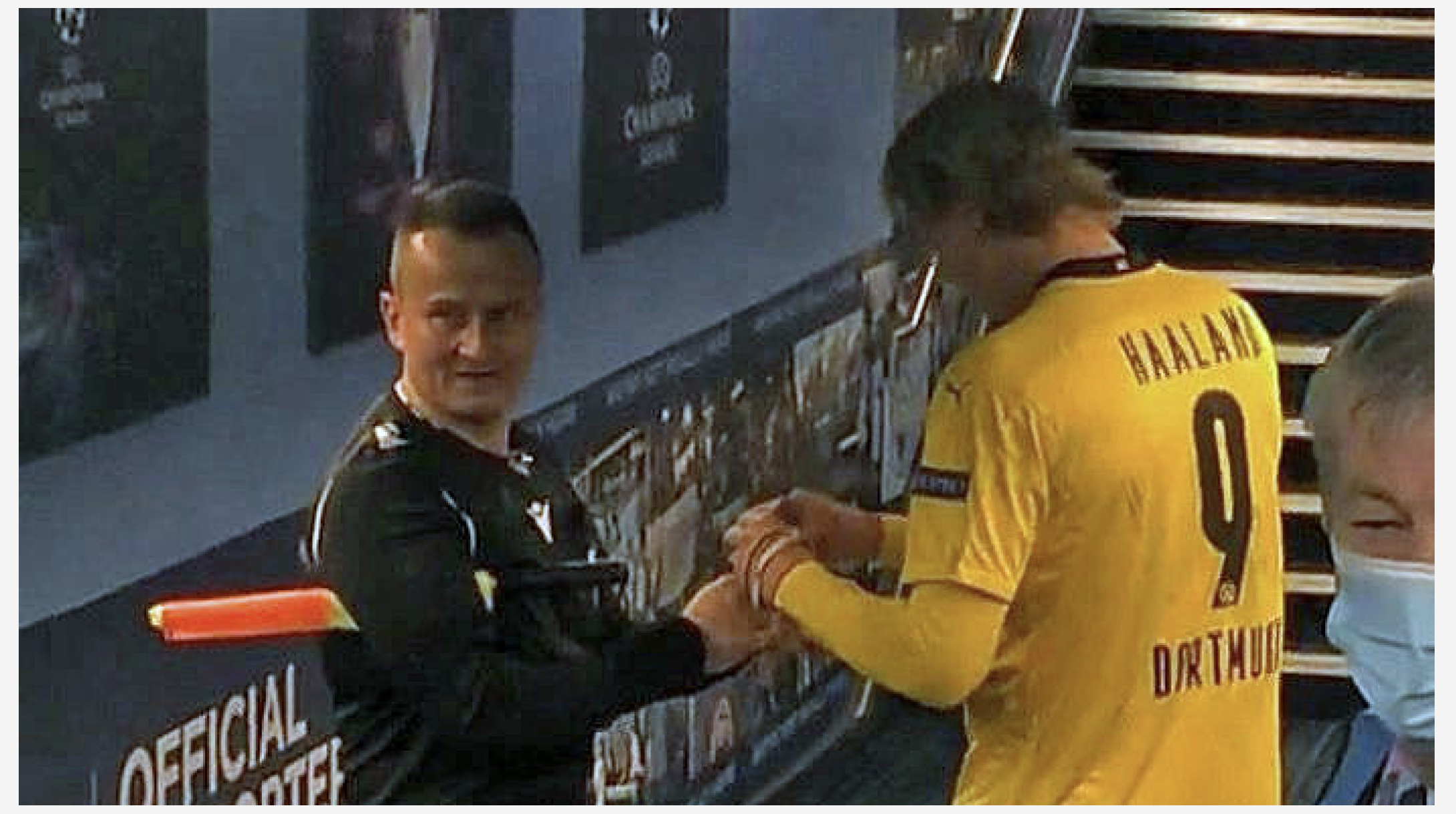 Ett bilde av assistentdommer Octavian Sovre og Erling Braut Haaland, etter Champions League-kvartfinalen mellom Manchester City og Dortmund, fikk fotballverden og verdenspressen til sperre opp øynene.
